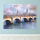 At the forefront of the painting, the River Thames flows calmly, reflecting the vibrant colors of the sky and the bridge itself. The brushstrokes are vibrant and energetic, conveying the movement of water and the shimmering reflections of light on its surface. The bridge spans across the canvas with arches and supports rendered in a mix of solidity and the ephemeral quality of light.