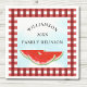 Add these cheerful paper napkins to your table decor. They are decorated with watercolor watermelons and a blue sky on a red and white buffalo check background.