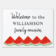 This Family Reunion Welcome Sign is decorated with red watercolor watermelons.