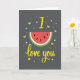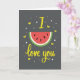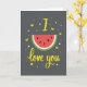 This greeting card features a charcoal gray background with the message “I love you” arranged in a simple, eye-catching way. The word “love” is shown as a slice of watermelon, with bright red flesh, a green rind, and small black seeds. Above it, a big yellow “I” sits near the top, and below it, “you” appears in the same yellow in a smooth, handwritten-style lettering. Small yellow hearts and scattered white dots are sprinkled around the design like little sparks, adding a sweet, happy feel. The contrast of the dark background with the sunny yellow and the red-and-green fruit makes the message easy to notice right away. It feels meaningful because it says “I love you” in a light, friendly way that still comes across as real and caring 🥰❤️.