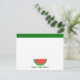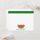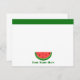 A flat notecard featuring an illustration of a watermelon slice at bottom. Personalize with your name in green under slice. Green stripe at top.