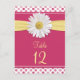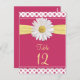 Watermelon pink and canary yellow Shasta daisy polka dot table number cards for your wedding, bat mitzvah, sweet 16 birthday, or other special occasions. Change the table number, add one card to your cart, then change the table number again, and add the next one to your cart. Repeat the process until you have all the table cards you need. To change the number, just type it in the box under personalize it. If you want to make other changes to the text, including changes to the font, font color, font size, or text placement, use the customize it option. If you want a front and back option, order two of each and then glue them together.