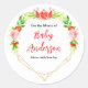 This fun and whimsical baby shower bookplate sticker features watercolor watermelon, pomegranate, strawberries, cherries and foliage on a gold geometric frame. The text combines handwritten script and serif fonts for a stylish and modern look. This is perfect for a summer rustic baby shower.