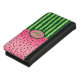 Super cute wallet phone case has a watermelon rind design on the bottom and a pink with black seeds pattern at the top. In the middle is an oval shape in pink and green where you add your name and initial.