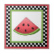 Add color and freshness to your dining table or to your kitchen décor by using these delightful, juicy Watermelon Square Checkerboard Tiles & Trivets. Watermelon is a mouth-watering original illustration created by Debi Payne Designs. Its beautiful variegated shading of watermelon pink is the focal point of this luscious slice of watermelon resting within it thick crisp rind of variegated greens. Accenting this slice of watermelon are the random placed black seeds. This delectable slice of watermelon is surrounded by a classic black & white checkerboard border. Personalize any of the Watermelon products by adding your name or any text you choose. Collect all the fruit and vegetable products in the Debi Payne Designs Kitchen Collection.