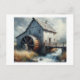 A rustic watermill stands by a flowing stream, surrounded by tall grasses under a soft, cloudy sky. The wooden wheel and weathered exterior add a sense of timeless charm to the scene.