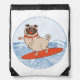 Wave riding happy pug dog on surfboard drawstring bag