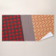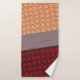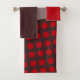 This towel set has a red washcloth, a brown hand towel, and a bath towel with a mid-century modern design of orange wavy lines on a gold background, red circles on a brown background, and a grey background. If you want the same design with different colors, message me.