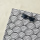 This beach towel has an Art Deco design of black curved lines in a triangle shape on a field of white repeated across the design.
