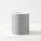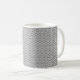 This mug has an Art Deco design of black curved lines in a triangle shape on a field of white repeated across the design.