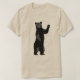 A black bear standing upright solemnly waves hello (or goodbye) with a raised paw in this simple, humorous illustration reminiscent of an internet meme. A funny greeting that makes a great conversation starter.