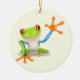 As its name suggests, the red-eyed tree frog has red eyes with vertically narrowed pupils. It has a vibrant green body with yellow and blue, vertically striped sides. Its webbed feet and toes are orange or red. The skin on the red-eyed tree frog's belly is soft and fragile, whereas the back is thicker and rougher. Red-eyed tree frogs have sticky pads on their toes.