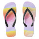 The perfect colorful flip flops for women who enjoy abstract art inspired designs. This pair of flip flops is bright colored and has wavy lines and abstract shapes.