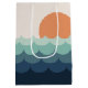 Abstract wavy blue ocean at sunset illustration with blue stormy waves and sun decoration for everybody who likes nature and simple elegant summery landscape designs.