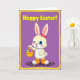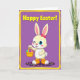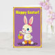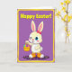 This card shows an illustrated, anthropomorphic bunny with a creamy coat and bright blue eyes, set against a rich purple background 🐰. Its long ears are lined in pink, and a small red bow sits near the top of its head, adding a sweet, friendly touch. The bunny’s rosy cheeks and gentle wink feel like it’s sharing a private, affectionate joke with the viewer, like a note passed between close friends. It wears orange boots and holds a sunny yellow basket filled with colorful eggs in green, purple, and red, tucked close as if it’s bringing a treat to someone special 🐇. A thick, wavy yellow frame wraps around the scene, giving the illustration a cozy, finished edge. Near the top, the words “Happy Easter!” appear in rounded yellow letters outlined in orange, centered above the bunny. Near the bottom, multicolored confetti-like dots scatter over a dark oval shape beneath the bunny’s feet.