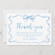 Show your appreciation with style using our Wavy Ribbon Frame Dusty Blue Bow Baby Shower Thank You Card. Adorned with a charming dusty blue bow and delicate wavy ribbon frame, this card emanates elegance and warmth. Customize it with your heartfelt words of gratitude, conveying your thanks for the thoughtful gifts and support received. Each recipient will feel truly valued and cherished as they receive this beautiful token of appreciation. Say "thank you" in a way that's as memorable as your special day with this stunning and sincere card.