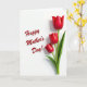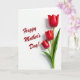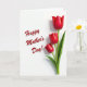 Designed with a bright white background, this card pairs simple florals with a loving Mother’s Day message ❤️. Three closed tulip-like flowers sit on the right side, painted in deep crimson with a soft sheen that catches the light along the curved petals. Their stems and pointed leaves are a fresh green, rising upward in a gentle stagger that feels like a caring gesture reaching toward someone. On the left side, the words “Happy Mother’s Day!” appear in flowing red lettering, sized large enough to balance the flowers without crowding them. A faint shadow under the text and along the petals gives everything a subtle raised look, like the message is leaning in close. The wide open space between the words and the blooms creates a calm, affectionate pause, like a quiet moment shared between two people 🌼. The three flowers are arranged vertically with the tallest bloom near the upper right corner and the shortest closer to the center-right edge.