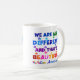 Inspirational quote of “We Are All DIFFERENT And That's BEAUTIFUL” with unique Autism puzzles, and colorful butterflies flying on the background to support and advocate Autism Awareness.