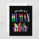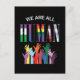 Social justice themed design features multi-color "We are all human" text and hands representing the LGBTQ community