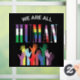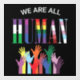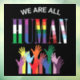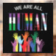 Social justice themed window cling design features multi-color "We are all human" text and hands representing the LGBTQ community