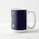 Cool fun coffee mug with a printed image of 3/three green alien heads on a very dark blue background, with a caption/phrase which reads "WE ARE HERE"