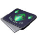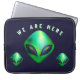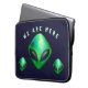 Cool fun laptop sleeve with a printed image of 3/three green alien heads on a very dark blue background, with a caption/phrase which reads "WE ARE HERE"