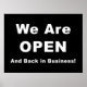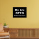 A simple yet bold black poster that is suitable for business purposes that states, “WE ARE OPEN and back in business” to be displayed for a business, organization or group that has been temporarily closed. A great way to let everyone know that you are open and back in business. Displaying it in your store window is an option.