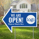 Royal Blue and White - If you have been closed through the pandemic and want to let the world know that you are now open, here is a simple sign with a directional arrow and logo pointing right at your store front.Customize with your company logo and information and make it yours. You can change the background color in the design area.
