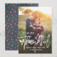 "We are Thankful" in modern white Letter with Customizable Photo and Message, Family Name, and Year. Background with cute modern royal blue and red Pattern. An elegant Card to sent fall-themed, or thanksgiving messages to customers, clients, family, and friends. You can find more Thanksgiving and Fall-themed Designs in my shop.