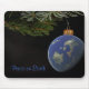 World ornament hanging from a pine bough.
