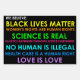 We Believe: Black Lives Matter, Women's Rights are Human Rights, Science is Real, Injustice Anywhere Threatens Justice Everywhere, No Human is Illegal, Health Care is a Human Right, Love is Love