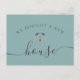 Stately teal house design, set over a cream background, features your move details in matching modern script calligraphy.