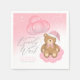 Celebrate the coming of your bundle of joy with this adorable we can barely wait snowy pink winter Christmas baby shower napkin featuring a sleepy bear wearing a pink santa hat and bow holding balloons sitting on a sparkly cloud.
