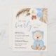 Boho budget-friendly baby boy shower invitation featuring a watercolor of a cute teddy bear, a bouquet of taupe, blue and terracotta pampas grass and florals and "We Can Bearly Wait" in a mix of simple typography and a stylish blue swash script.