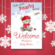 We Can BEARLY Wait Baby Shower Welcome Sign, featuring cute bear in winter hat and scarf, red accents, baby blue and white snowflakes
