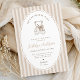 This charming neutral teddy bear baby shower invitation features a soft striped background, an elegant oval arch frame, and a hand-drawn teddy bear illustration.