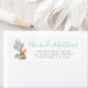 This adorable return address label features a cute tan teddy bear with a pink bow, and blue present box, holding a mix of pink and blue watercolor balloons, placed on the left side. The right side displays your name in soft blue script with the address in a classic gray serif font. The charming design, complete with a blue gift box, is perfect for a gender neutral or surprise gender baby shower. The mix of playful and elegant fonts adds a sweet touch, and you can customize the colors and background to match your theme.