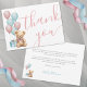 “We can BEARly wait” sets the tone for this adorable baby shower thank you card, perfect for a gender-neutral celebration or a surprise gender reveal. The front features a cute tan teddy bear with a mix of pink and blue accents, such as a bow and small present, along with the words “Thank You” in pink script.