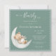 We can bearly wait theme baby shower invitation. Adorable hand drawn teddy bear sleeping on a moon. The simple soft colors sets the tone for a sweet gender neutral themed baby shower. Such a sweet and simple invitation for that special event. Coordinating blue scalloped frame finish off this adorable invite.
