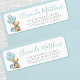 This adorable return address label features a cute tan teddy bear with a teal blue bow, holding teal watercolor balloons, placed on the left side. The right side displays your name in a soft, elegant blue script with the address in a classic gray serif font. The charming design, complete with a teal gift box, is perfect for a baby boy’s baby shower. The mix of playful and elegant fonts adds a sweet touch, and you can customize the colors and background to match your theme.