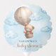Cute baby design for boy Baby Shower party features cute Watercolor blue and brown teddy bear in brown hot air balloon. Kidish script typography say "We can bearly wait for baby to arrive".