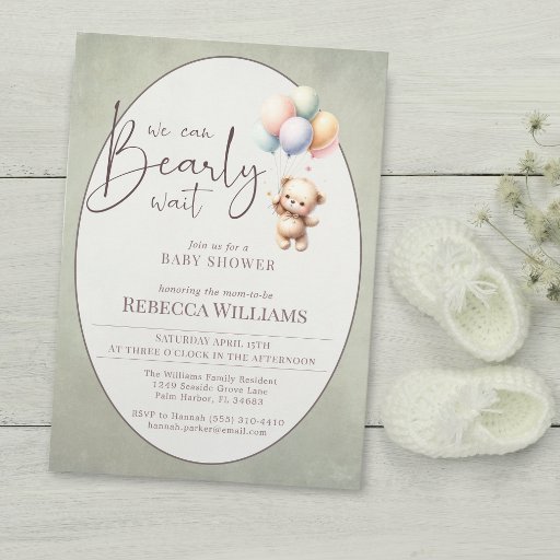 Celebrate the upcoming arrival of a little one with this adorable gender-neutral baby shower invitation. Featuring a cuddly teddy bear floating with pastel balloons and the playful phrase “We can bearly wait,” this design blends cuteness with simplicity for a timeless look. The soft neutral colors make it perfect for both baby boys and girls, while the clean typography keeps the layout modern and easy to read. A lovely choice for parents-to-be who want a sweet, charming, and unisex baby shower theme.