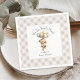 A cute baby shower napkin with a baby girl teddy bear popular theme - "We Can Bearly Wait!". An adorable girl teddy bear with bow in her hair floats suspended in air with a bunch of balloons. A whimsical font spells out the shower theme along with the Mommy-to-Be's name that you can personalize with your guest of honor's name. Bordered in a neutral beige gingham pattern, the look is stylish and so cute!