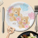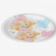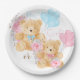 Gender reveal party Plates featuring watercolor bears illustrations of pink and blue balloons and a bow with text on the top that says "Boy or Girl."