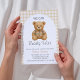 A rustic themed baby shower "We Can Bearly Wait" featuring cute preppy bear wearing luxury designer plaid outfit in brown, beige colors and gingham background. You can easily personalize this with your details.