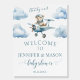 Welcome your guests in style with this elegant light blue "We can bearly wait" themed baby boy shower welcome sign. Crafted on a sturdy foam board, the sign showcases a cute watercolor teddy bear soaring on an airplane, adding a delightful touch to your event. Explore this charming design for a warm and inviting atmosphere that sets the tone for a memorable celebration.