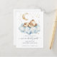 An adorable teddy bear sitting on a cloud with stars above, with the expression: "we can bearly wait". A trendy cute style for your big announcement. Modern serif type contrasted with script typography. An economical budget friendly postcard version.