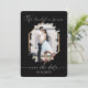 This elegant and simple photo wedding engagement save the date is perfect for any modern couple. It features a black brushstroke halo vignette on top of a photo of the couple outlined in a faux printed gold foil diamond border with white handwritten signature script typography. It's minimal, chic, pretty, and beautiful to announce your special day. On the back features a simplistic text setup with the phrase, "The future Mr. and Mrs." ***IMPORTANT DESIGN NOTE: For any custom design request such as matching products, color changes, placement changes, or any other change request, please message the designer. You can even submit a request for a completely custom and new design.
