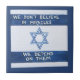 A hand-painted, blue-on-white, sign posted outside a shop in the Israeli town of Rosh Pina. The sign has English-language text reading, WE DON'T BELIEVE IN MIRACLES, WE DEPEND ON THEM" on a representation of Israel's flag.
