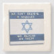 A hand-painted, blue-on-white, sign posted outside a shop in the Israeli town of Rosh Pina. The sign has English-language text reading, WE DON'T BELIEVE IN MIRACLES, WE DEPEND ON THEM" on a representation of Israel's flag.